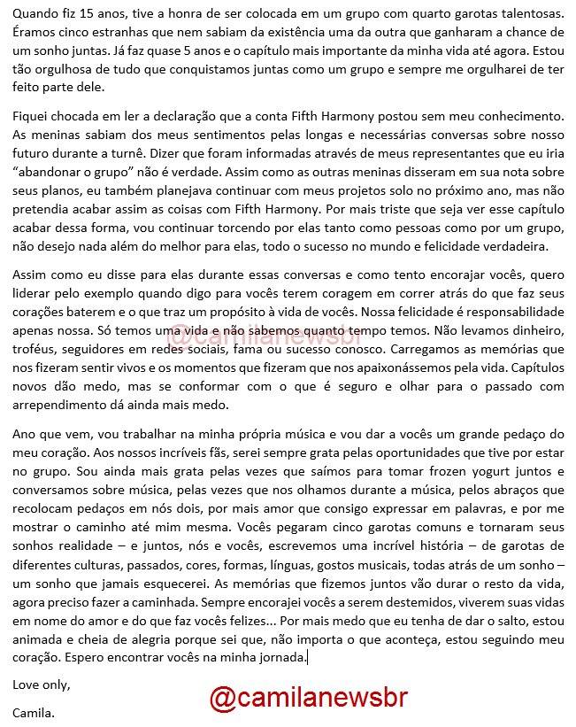 Camila Cabello deixou todo mundo surpreso com sua saída da girlband formada no The X Factor USA 2012, Camila contou sua versão do que teria realmente acontecido, o texto abaixo foi traduzido pelo @Camilanewsbr.